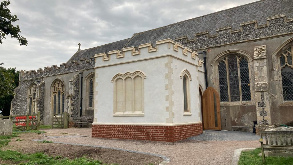 Although planning started in 2016, it took much time, fund-raising and energy to make this happen, The church was closed for a year (2022-2023) to allow building work to take place. Built in 1500, the Great Tower has withstood the elements for nearly 600 years, but ensuring it remains standing for another six centuries required a significant programme of restoration. Scaffolding was erected around the Tower to give access to the parapets, pinnacles, stonework and other exterior parts that need replacing. Foundations and drainage were installed for the small extension on the north side that houses the much-needed amenities.